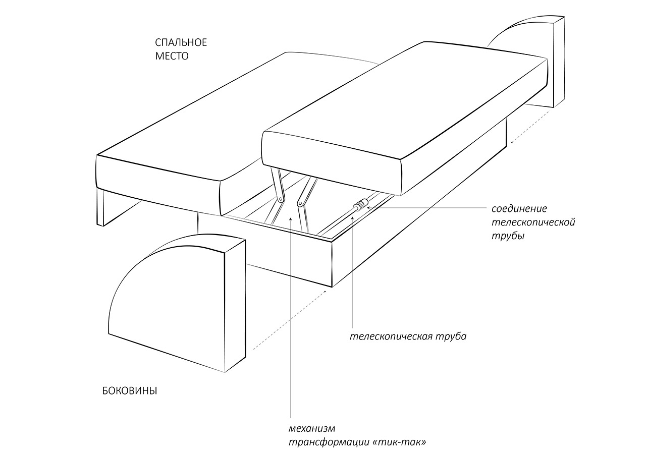 - «ножницы» (поворотный механизм) - практичный, но более дорогостоящий вариант, обеспечивает легкую трансформацию, за счет одного поворота подвижной части (на 90 градусов), давая в результате удобное спальное место;